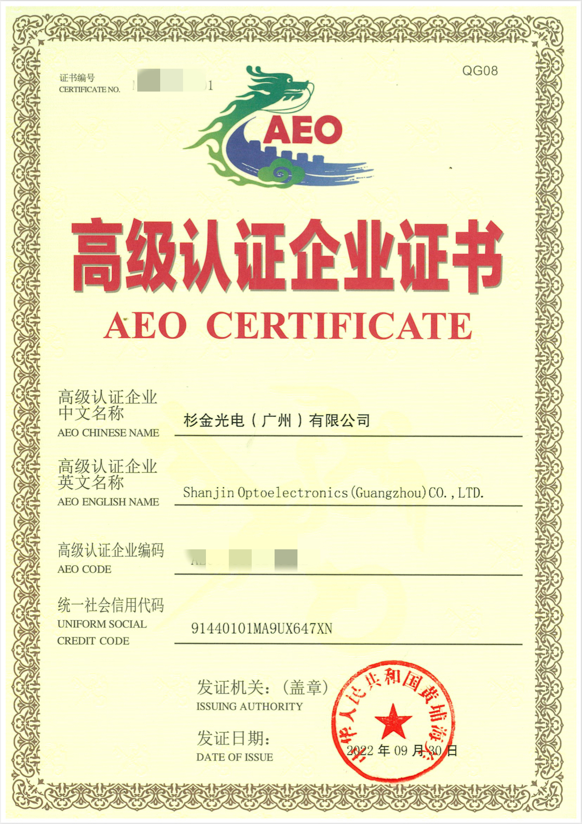 杉金廣州獲得AEO高級認證企業(yè)證書! 2022年10月17日 10月上旬,中國海關企業(yè)進出口信用信息公示平臺上,杉金廣州的信用等級從“注冊登記和備案企業(yè)”升級為“高級認證企業(yè)”。
