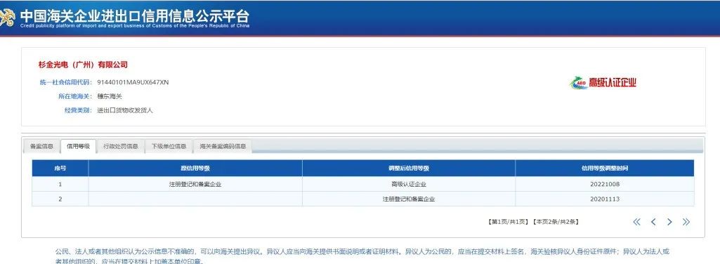 10月上旬,中國海關企業(yè)進出口信用信息公示平臺上,杉金廣州的信用等級從“注冊登記和備案企業(yè)”升級為“高級認證企業(yè)”。