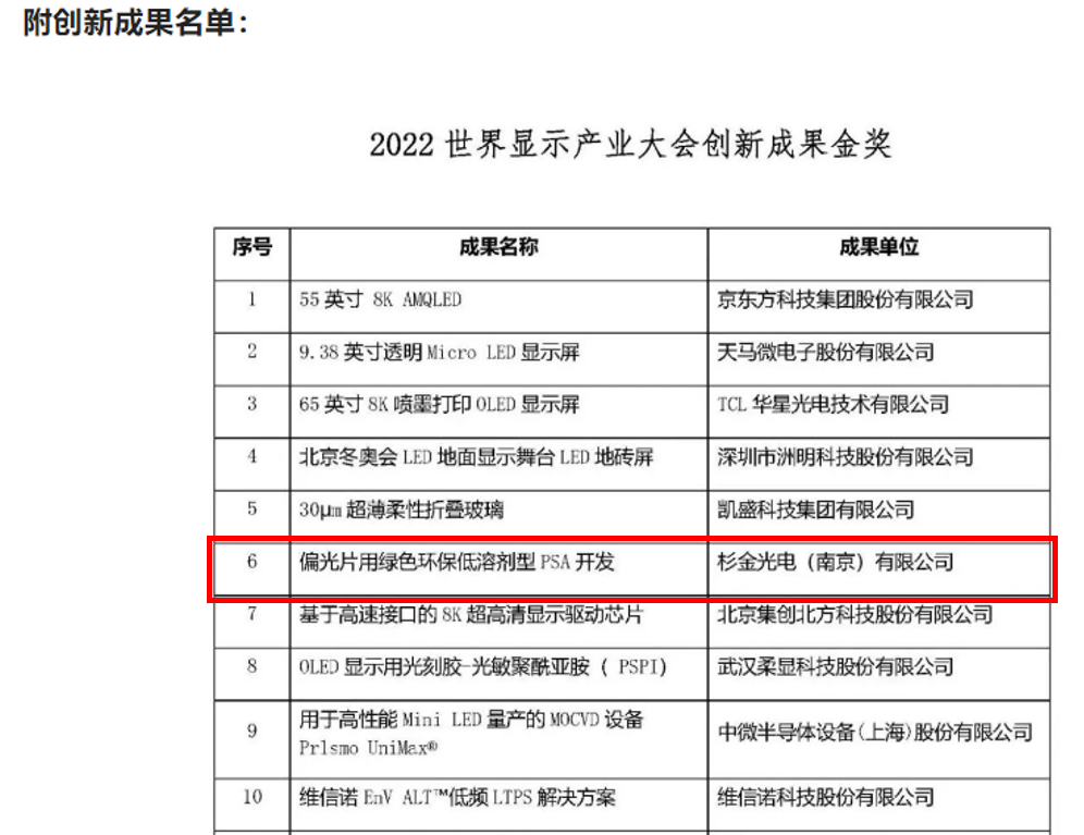 經(jīng)中國光學光電子行業(yè)協(xié)會液晶分會、國際信息顯示學會(中國區(qū))、中國半導體行業(yè)協(xié)會、中國電子視像行業(yè)協(xié)會、中國電子材料行業(yè)協(xié)會、中國電子專用設(shè)備工業(yè)協(xié)會、中國OLED產(chǎn)業(yè)聯(lián)盟、世界超高清視頻產(chǎn)業(yè)聯(lián)盟、虛擬現(xiàn)實產(chǎn)業(yè)聯(lián)盟等9家國內(nèi)外重點行業(yè)機構(gòu)及大會組委會辦公室推薦,專家委員會綜合技術(shù)領(lǐng)先性、市場競爭性、應(yīng)用體驗性,推選出2022世界顯示產(chǎn)業(yè)大會創(chuàng)新成果金獎15項,優(yōu)秀獎30項。其中,杉金光電綠色環(huán)保低溶劑型PSA榮獲2022世界顯示產(chǎn)業(yè)大會創(chuàng)新成果金獎。