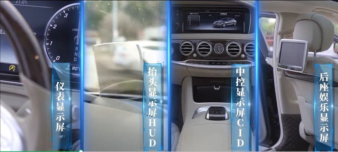 車載顯示屏。當下主要可分為四大類:儀表顯示屏、抬頭顯示屏(HUD)、中控顯示屏、后座娛樂顯示屏。