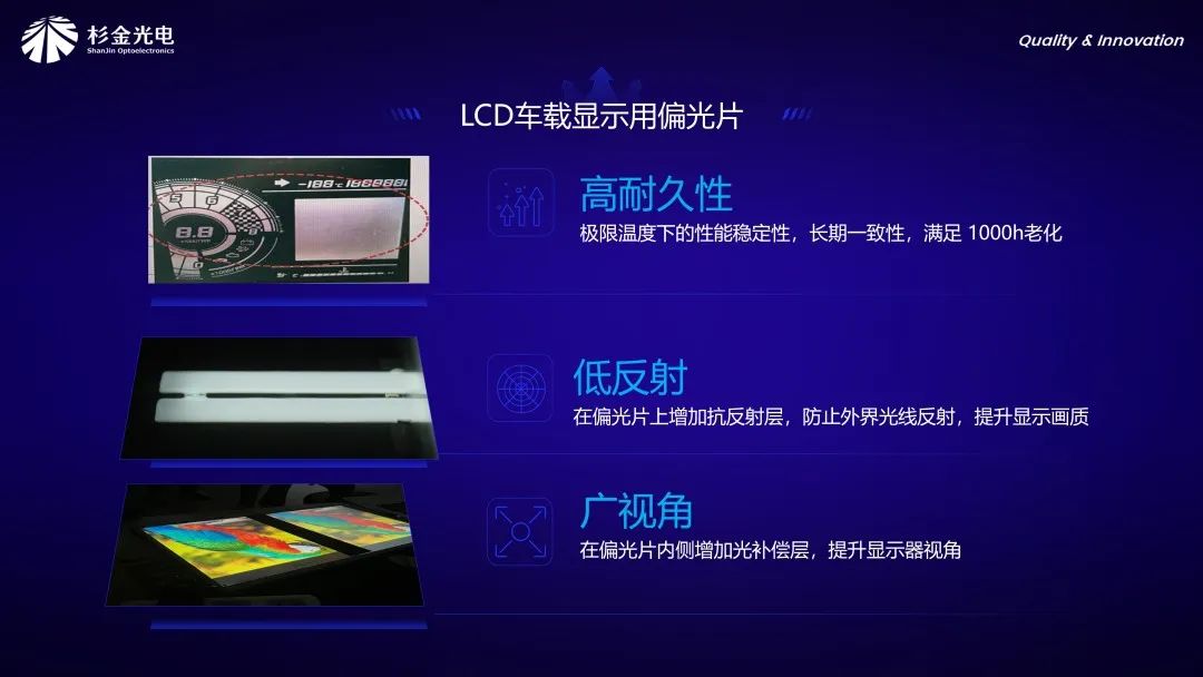 為提升駕駛安全性,車載顯示屏的清晰度規格日益嚴格,以確保駕駛員可從更廣的視角觀看屏幕,而非僅從正面觀看。這就需要車載顯示用偏光片滿足高對比度和廣視角的要求。針對車載偏光片更高的性能要求,杉金光電開發了兩大類產品。